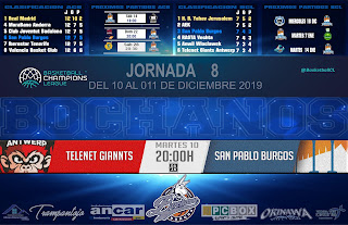Partido más complicado de lo que parece. A pesar de que el conjunto belga es último de grupo, se encuentra a tan sólo 2 victorias del San Pablo. Además, el Telenet Giants Antwerp ha tenido que jugar un partido de más fuera de casa en esta primera vuelta, por lo que la segunda tanda le es mucho más propicia. Les vendrá bien, pues una derrota en esta jornada les dejaría casi sin opciones de pasar de fase. Por su parte, el Miraflores debe lidiar con un partido duro en Madrid y un viaje a la ciudad de Amberes sin pisar Burgos, pues entre el inicio del partido de ACB y éste de competición europea, tan sólo ha habido 48 horas de diferencia.